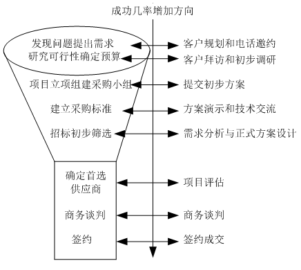 | 企業業務管控需要一套完善的管理系統,我們這里特別設定企業業務管控系統。它不僅僅是一種管理理念,同時也是一個管理體系、一個操作性很強的管理系統。 業務管控系統非常提倡過程管理,而且控制過程比控制結果更重要。在銷售中,一個銷售項目受到太多來自內部和外部因素的影響,其結果的成敗與否是難以預測和控制的。 一、業務管控系統的特點 主要是讓原來只掌握在銷售人員手中的有關銷售過程的信息向銷售團隊、銷售經理和企業公開,使得: l 銷售人員的信息更加公開化,便于掌控客戶的進展; l 讓項目的銷售過程更加明確化,標準化,系統化; l 便于項目內部的角色分工,使團隊合作進一步加強; l 更好地做好銷售管理與銷售預測的工作; l 企業積累應有的銷售知識和客戶資源。 二、企業業務管控系統的模型圖 如圖6-1所示。 ![]() 圖6-1 企業業務管控系統的模型圖 基礎組成要素:了解客戶內部采購流程 客戶內部采購流程是從客戶的角度對整個采購過程一般必須經過的步驟進行劃分和描述。它通過跟蹤和記錄客戶采購目前的狀態以及客戶、競爭對手的回應,依據對內部采購流程的劃分,分析并確定目前客戶采購所處的階段。讓我們更清晰的去了解,如何去對這八大流程階段進行分析,該從哪幾個方面進行著手??蛻魞炔坎少徚鞒贪藗€階段如表6-1所示。 表6-1 八個階段表 ![]() 1、 發現問題,提出問題; 一般公司都是有現成的供應商,我們的機會點就在尋找目前客戶與現有供應商合作中的不滿意或者問題,往往問題越大,我們的機會點就比較有優勢。所以,在采購方的需求醞釀的階段,銷售方在這個階段介入明顯是最好的時機,畢竟“先入為主”,銷售方可以在這個階段影響到采購方的后來的“采購標準”。 2、分析研討,確定預算; 了解目前項目的預算,確立項目立項的可能性,萬一項目的預算少了,一般都要通過老板來進一步申請,這時,往往與老板見面的可能性較大,有時項目的經辦人無法說服他自己的老板,有可能請你協同說服。 3、項目立項,建立小組; 緊接著,在客戶項目立項階段,銷售顧問應當提供準確信息,培養內部的spy立項,準備應標。因此需要對內部采購流程相當了解,如此才能建立項目采購的優勢。 4、建立標準,穩定目標; 當客戶的采購部門開始收集信息和標書時,銷售顧問應當在內部確認招標范圍,主動了解技術表述的內容,參與制定采購標準,目的是為了建立客戶關系,同時了解競爭對手以及客戶內部的關系。 5、確定招標,初步篩選; 經辦人通常是客戶內部的采購經理類的角色,他需要發布信息,收集信息,同時,初步篩選合格的供應商,一般是從十家供應商剩下三家等,為確定首選供應商做鋪墊。 6、認準首選,篩供應商; 通過技術標與商務標的因素而確立篩選的標準,例如:價格、質量、品質、品牌、行業標準、職業化、關系等因素來選擇首選的供應商。 7、合同審核,合作談判; 最為采購方來說,確定供應商后,要在談判中盡量壓低成本,并為企業爭取有利的付款方式降低風險。該項目后續實施如何很大程度上取決于合同條款上的具體規定,所以該過程是非常關鍵的,客戶可能專門組織談判小組,與首選供應商來談具體的條款。 8、雙方商定,簽約成交。 商務具體條款雙方商定后,雙方法人簽署合同。開始進入具體的合作及售后服務階段,在該階段之前,可以說銷售方是很成功的,否則,對方也不會選擇和你合作。有人錯認為銷售活動到此結束了,其實還沒有,這只是個開始,如何將該客戶綁定為企業的忠實客戶,這就需要銷售方在實施及售后客戶關系維系方面下工夫了。 該管控系統的起點是客戶內部采購流程。產品、服務的供應方了解客戶內部采購流程的目的是為了提高銷售的成功率。每個客戶都有自己的一套內部采購流程。供應方想要實現銷售,必須按照客戶的規則行事,根據客戶的內部采購流程來一步一步推進銷售過程,如果無法隨著客戶內部采購流程不斷前進,就代表著供應方的銷售失敗了。因此,在銷售中,供應方在規范化企業內部的銷售流程之前,應該首先關注客戶內部的采購流程??蛻魞炔坎少徚鞒倘绻磺逦?,就不知道應該如何根據客戶的采購流程做出及時準確的響應。 客戶內部采購流程是該管理系統的基礎組成要素。銷售最大的特點就是“以客戶為中心”,在實際銷售中的做法就是:尊重客戶的興趣、需求和規則。因此,業務管控系統將“尊重客戶的規則”放在了第一位,銷售和管理都是圍繞著客戶內部采購流程展開的。銷售流程管理系統從兩個方面向我們介紹客戶內部采購流程。首先是從理論推廣的角度,向我們介紹了客戶的內部采購流程的一般形式和步驟。其次是從實際應用的角度,向我們介紹客戶內部采購流程的操作和應用,譬如如何根據客戶內部采購流程來收集和使用有關客戶、競爭對手的信息。 主要組成要素:業務推進流程 我們知道,處于內部采購流程不同階段的客戶位于銷售漏斗的不同狀態。隨著內部采購流程的推進,客戶所在的狀態也在向銷售漏斗底部的最佳狀態推進,這也意味著銷售的成功幾率的逐步上升。 如何保證客戶的內部采購流程順利向前推進呢?也就是說,作為銷售一方,我方應該做出哪些努力呢?我們為了保證客戶內部采購流程順利向前推進而做出的努力所形成的軌跡,就是我們的業務推進流程。 對應于