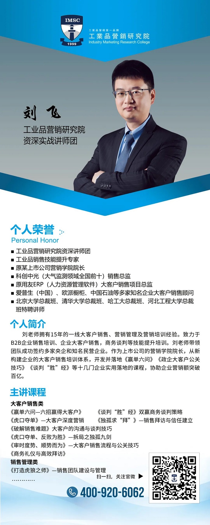 針對目前中國工業品企業上述諸多問題和現狀,“工業品營銷研究院”圍繞工業品營銷人才必備的能力,特開設基于能力為導向的“工業品營銷人才壓模訓練系統”。是基于17年來工業品營銷研究院300多家工業品企業的咨詢經驗,3000多家工業企業營銷培訓的深厚經驗,主要是為批量復制工業品營銷人才,使工業企業營銷團隊新人能力提升更快,老銷售人員的能力培養更加系統化規范化,使公司的營銷更加的切實有效,并且能夠書面化、流程化、體系化的一個訓練系統,讓營銷知識技能得以傳承,并在訓練后對其進行評估、認證,考核合格后正式上崗。